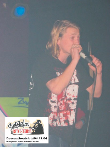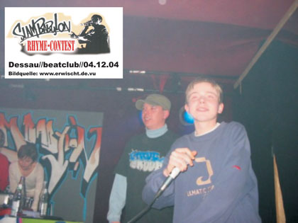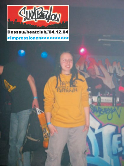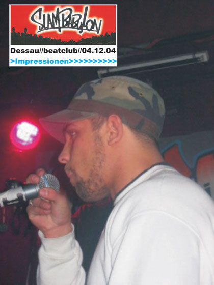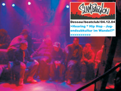 Unter dem Motto „Slam Babylon“ wollten am 04. Dezember im Dessauer beatclub gleich mehrere bundesweit agierende Gruppen und lokale Sprechgesangs-Crews beweisen, das Hip Hop mehr ist als die Zuschaustellung halbnackter Körper in den einschlägigen Musiksendern. Dass dieses Konzept offensichtlich attraktiv erscheint und die HopperInnen zu Unrecht als personifizierte Spaßgesellschaft verschrien sind, bewiesen die 180 Gäste der Veranstaltung und dass trotz eines parallel stattgefundenen Events mit einer namhaften Crew. Die Initiativen „Beatz for Peace“ und „Hip Hop Partisan“ traten vor einigen Monaten an die hiesige Szene und andere Kooperationspartner heran und begeisterten mit ihrem Konzept schnell die Protagonisten. Neben der Streetworkerin des Dessauer Jugendamtes, Katrin Fuchs, und der Kommune, konnte noch die im Alternativen Jugendzentrum ansässige Netzwerkstelle gegen Rechts ins Organisationsboot geholt werden. Finanziell unterstützt wurde die ganze Sache vom Jugendbildungswerk der Rosa Luxemburg-Stiftung, die sich damit erstmals explizit ins Terrain einer Jugendsubkultur wagte.