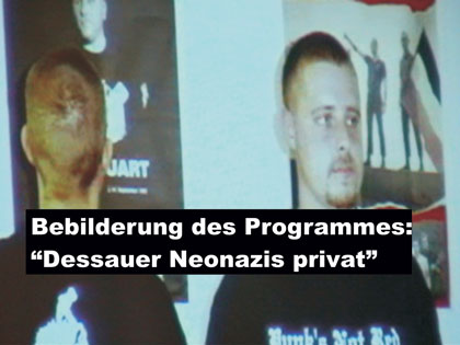 Insbesondere die inhaltlichen Bühnenbeiträge, wurden zudem durch eine Diashow ergänzend visualisiert. Kam der Rechtsextremismus/Neonazismus zur Sprache, waren u. a. Bilder von Dessauer Neonazis und diversen rechten Aufmärschen zu sehen. Die Verbrechen des Deutschen Nationalsozialismus, wurden an hand von Bildern aus dem ehemaligen Frauenkonzentrationslager Ravensbrück konkret benannt.
