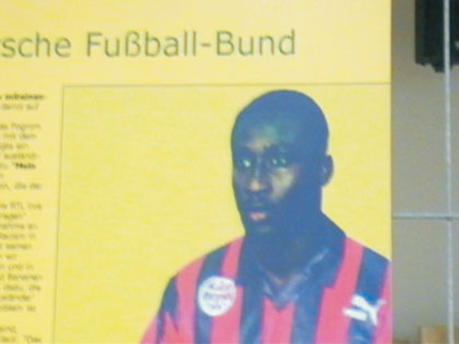 Gerd Dembowski, Buchautor, einer der maßgeblichen Ausstellungsmacher und seit 1993 Mitglied im „Bündnis aktiver Fußballfans“ (BAFF), spricht dann in seiner Einführung Klartext. Dass Rassismus und Diskriminierung in Stadien ein wirkliches Problem sei, zeige allein schon die Existenz der Initiative BAFF. Diese engagiere sich schon seit über zehn Jahren gegen Rassismus und verfüge bundesweit über immer hin 7000 Mitglieder.