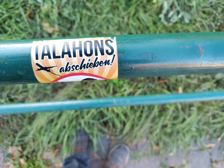 An der Bushaltestelle „Grundschule“ in der Burgstraße wird ein ganzes Konvolut von neonazistischen Aufklebern dokumentiert. Die Motive „Ku Klux Klan – Weiße Macht – Tradition seit 1925“ und „Ku Klux Klan – White Power – Section Germany“ beziehen sich unverhohlen positiv auf den rassistischen, antisemitischen und gewalttätigen Geheimbund aus den USA. Bei dem Aufkleber „I Love NS“ ist der positive Bezug zum historischen Nationalsozialismus offensichtlich. Und dem Motiv „Talahons abschieben“ ist in Sprache und Ikonographie der rassistische Gehalt schon anzusehen.