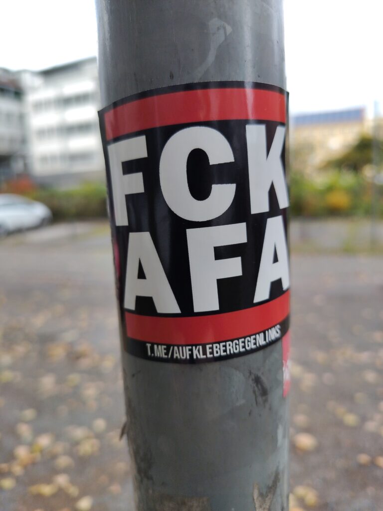 In der Dessauer Innenstadt wird ein Aufkleber mit der Aufschrift „FCK AFA“ (Scheiß Antifaschistische Aktion) entdeckt. In der Logik von Neonazis ist hier nicht davon auszugehen, dass damit nur im engsten Sinne die politische Feindschaft zu vermeintlichen oder tatsächlichen, antifaschistischen Gruppierungen oder Bewegungen zum Ausdruck kommt.