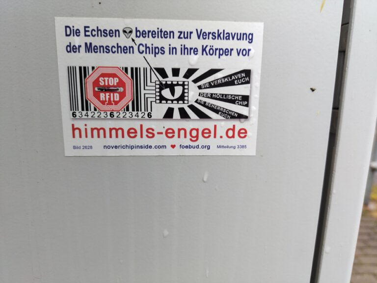 An einem Stromkasten in Dessau-Kochstedt wird ein Aufkleber mit der Aufschrift „Die Echsen bereiten zur Versklavung der Menschen Chips in ihre Körper vor“ festgestellt. Die darauf ausgewiesene Homepage verweist auf die verschwörungsideologische Gruppierung „Himmelsengel“. Dort finden sich in mehreren Sprachen krudeste Verschwörungserzählungen, u. a. die von den „Echsenmenschen“, zudem wird von einem „Großen Plan alle Menschen zu chippen“ schwadroniert. Insbesondere die Verschwörungserzählung von den „Echsenmenschen“, auch Reptiloiden genannt, ist strukturell antisemitisch.