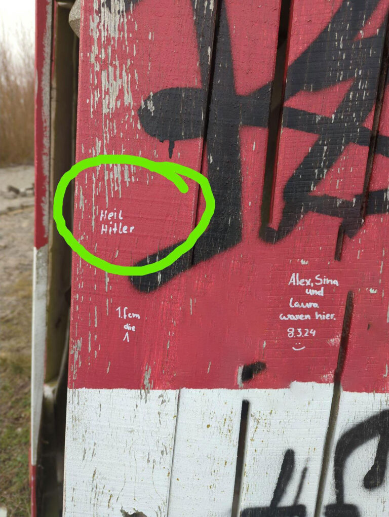 Am Akener Akazienteich wurde an der Außenverkleidung des Strandturms der verbotene Schriftzug „Heil Hitler“ festgestellt, der offenbar mit einem weißen Permanentmarker aufgetragen wurde und einen Umfang von ca. 4,5 mal 4,5 cm hat. Es könnte sein, dass mit demselben Stift dort weitere Informationen hinterlassen worden. Eine Strafanzeige wurde erstattet, der polizeiliche Staatsschutz ermittelt.