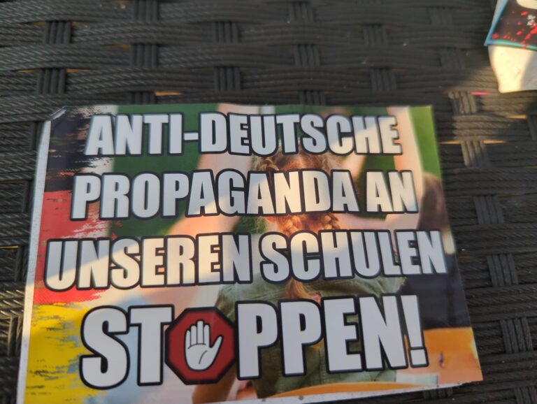In der Kleinzerbster Straße wird ein Aufkleber mit dem Aufdruck „Antideutsche Propaganda an unseren Schulen stoppen“ festgestellt. Dieses Motiv diskreditiert nicht nur pauschal alle Pädagog:innen an Bildungseinrichtungen, sondern stellt im rechtsextrem motivierten Subtext die Vermittlung und Auseinandersetzung mit den Verbrechen des Nationalsozialismus in Frage.
