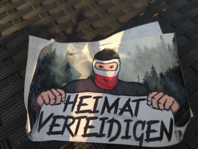 Im Bereich des Schützenplatzes wird ein Aufkleber mit dem Aufdruck „Heimat verteidigen“ festgestellt. Dieses Motiv spricht mit einem stilisierten und vermummten Mann, dessen Sturmhaube zudem in der extrem rechten beliebten Farbkombination schwarz-weiß-rot gehalten ist, für die Gewaltaffinität der Szene.