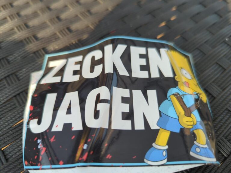 10. März 2025Im Bereich des Schützenplatzes wird an einem Schild des Tourismusleitsystems ein Aufkleber mit dem Aufdruck „Zecken jagen“ festgestellt. Dieses Motiv, zu beziehen über den Hooliganstreetwear-Versand „hanseatic“ aus dem Fußballkontext, spricht für die Gewaltaffinität der Szene.