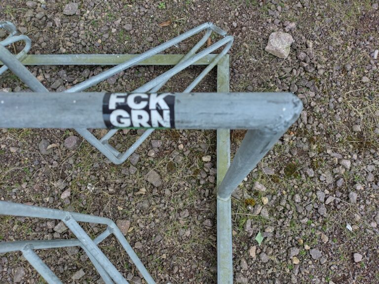 In Aken (Elbe) wird an einem Fahrradständer auf dem Parkplatz der hiesigen Sekundarschule ein Aufkleber mit dem Aufdruck „FCK GRN“ (etwa: „Scheiß Grüne“) entdeckt. Was auf den ersten Blick wie ein nicht extremistisches Meinungsbild aussieht, entpuppt sich schnell als Parole, die zusehends auch auf verschwörungs- und rechtsoffenen Demonstrationen und Kundgebungen aus dem Querdenkermilieu in der Region gezeigt wird.