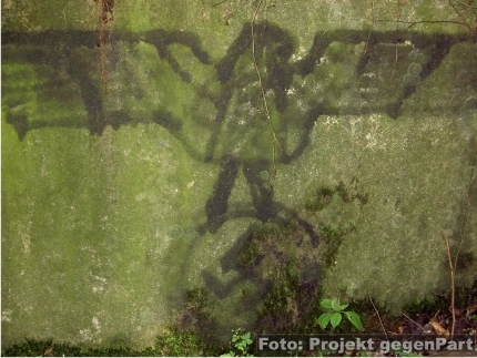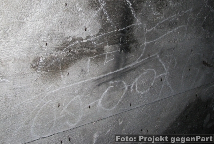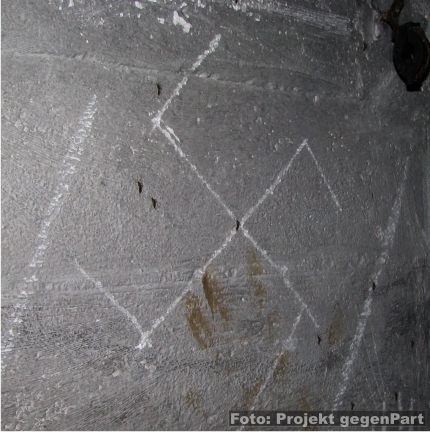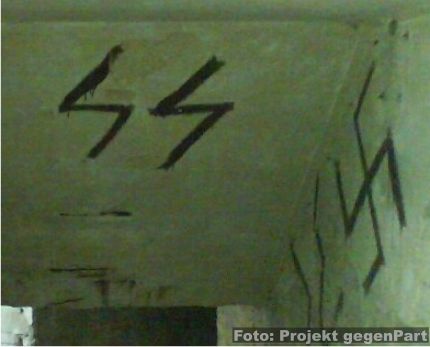 in unterirdischen Gängen finden sich noch zahlreiche Hakenkreuze und SS-Runen sowie volksverhetzende Slogans