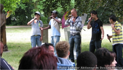 „Und wir alle wissen: Mord ist für Nazis kein Betriebsunfall.“"Woche der Erinnerung" in Gedenken an Alberto Adriano im Dessauer Stadtpark “Die Stühle sind dafür da, sich zu setzen“, bittet Moderator Joachim Landgraf die rund 100 Gäste, die zum Auftakt der „Woche der Erinnerung“ am 11. Juni in den Dessauer Stadtpark gekommen sind, Platz zu nehmen. Die Anwesenden schauen dabei immer wieder in den Himmel der Muldestadt, dort grummelt und donnert es. Doch das herannahende Gewitter zieht weiter und es bleibt trocken. Eine nahezu stürmische Erweiterung hat in diesem Jahr auch das Gedenken an Alberto Adriano genommen. Erstmals hat sich der Vorbereitungskreis unter Federführung des Multikulturellen Zentrums (mehr dazu hier…), dem darüber hinaus u. a. das Anhaltische Theater, die Stiftung Bauhaus, das Dessau-Roßlauer Bündnis gegen Rechtsextremismus, der Evangelische Kirchenkreis und das Polizeirevier angehören, dazu entschlossen, mit einer „Woche der Erinnerung“ die Ermordung des Mosambikaners vor acht Jahren zurück ins Gedächtnis der Stadt zu rufen. Das Projekt, vom Lokalen Aktionsplan für Demokratie und Toleranz unterstützt (mehr dazu hier…), ist dabei mehr als eine konzeptionelle Erweiterung des bisher alljährlich auf die Beine gestellten Begegnungstages (mehr dazu hier…) und. ![]() Durch andere Präsentationsformen, künstlerische Elemente und einer verstärkten Kooperation mit hiesigen Kulturinstitutionen, sollen andere Zugänge gefunden werden um damit nicht zuletzt die Wirkungsmächtigkeit des Gedenkens im lokalen Diskurs erhöht werden. Es geht den Organisatoren auch darum, die Debatte um Alltagsrassismus und rechte Gewalt weiter zu führen, auch und gerade in einem lokalen Bezugsrahmen. Denn diese Phänomene sind der anhaltischen Wirklichkeit nach wie vor immanent (mehr dazu hier…) und leider keine Entwicklungen, die um die Jahrtausendwende zum Stillstand gekommen wären. Das schätzt offensichtlich auch der Verwaltungsdirektor des Anhaltischen Theaters so ein. „Die Brutalität rechter Gewalt nimmt zu und unsere Zivilgesellschaft gerät in Gefahr.“, sagt Joachim Landgraf, der sich von Anfang an für die Initiative stark gemacht hat. Er ruft dazu auf, „im kleinen Kreis wie im Großen nicht zu zulassen“, dass rechtes Gedankengut weiter hoffähig wird. Bei der geplanten Umgestaltung des Stadtparkes müsse zudem darüber nachgedacht werden, wie man sich im Rahmen einer Erinnerungs- und Gedenkkultur mit dem Mord an Alberto Adriano auseinandersetzte. Landgraf versteht die Anwesenheit des Innenministers Holger Hövelmann ausdrücklich als Würdigung der Veranstaltung. ![]() Joachim Landgraf führt durch das Programm der Auftaktveranstaltung Doch bevor der SPD-Landesvorsitzende ans Mikro tritt, rappt die Hip Hop-Crew „G-Records“ in selbiges. Die interethnische Band, die sich aus Schülern mit und ohne Migrationshintergrund des Dessauer Philantropinums zusammensetzt, hat einen jugendkulturellen Zugang zum Thema, in der Sprache manchmal derb, aber dennoch erfrischend offen: „Wir wissen alle warum wir hier sind, es war feige ihn umzubringen.“ ![]() Rappen gegen Fremdenfeindlichkei: die Dessauer Hip Hop-Crew "G-Records" “Das war ein Schock für diese Stadt und dieses Land und ist es immer noch.“, beginnt Holger Hövelmann seinen Beitrag. Der Innenminister hat die Bekämpfung des Rechtsextremismus öffentlich zur Chefsache erklärt und lässt auch heute an dieser Prämisse keinen Zweifel: „Es strafft alle die Lügen, die den Rechtsextremismus immer noch als aufgebauschtes Problem ansehen.“ Wenig später wird er neu deutlicher: „Und wir alle wissen: Mord ist für Nazis kein Betriebsunfall.“ Hövelmann fordert eine Ächtung des Rassismus und im Umkehrschluss zugleich einen Integrationsprozess ein, an dem alle – nicht nur die Politik- aktiv mitarbeiten müssten. Der Fall Adriano zeige aber auch, dass nicht immer weggeschaut werde. Mehrere Bürger hätten so in der Tatnacht unabhängig voneinander die Polizei verständigt. Auf eine „Bereitschaft hinzugucken und auszusagen“ komme es an. Hövelmann sagt auch, dass die Polizei im Fall Alberto Adriano nichts falsch gemacht habe. Damit spielt der oberste Dienstherr aller Polizisten im Land augenscheinlich auf Ermittlungspannen und Versäumnisse bei der Bekämpfung rechtsextremer Straf- und Gewalttaten in Sachsen-Anhalt an, die in den letzten Monaten für eine breite öffentliche Debatte sorgten und mit denen sich im Landtag mittlerweile ein Parlamentarischer Untersuchungsausschuss befasst (mehr dazu hier…). ![]() Innenminister Holger Hövelmann will im Kampf gegen Rechts nicht nachlassen Der SPD-Politiker spart ein heikles Thema, gerade in Dessau-Roßlau, nicht aus: „Ich hoffe, dass ein Rechtsfrieden auch vom Urteil im Fall Oury Jalloh ausgeht.“ Seit März letzten Jahres sitzen vor dem Landgericht zwei Polizeibeamte auf der Anklagebank den vorgeworfen wird, durch Unterlassung für den Tod Oury Jallohs in einer Dessauer Polizeizelle mitverantwortlich zu sein. Der Asylbewerber verbrannte im Januar 2005 unter bisher ungeklärten Umständen, war an Händen und Füssen gefesselt und soll dabei mit einem Feuerzeug den Brand selbst entfacht haben (mehr dazu hier…). „Eins Strafbonus für Polizeibeamte darf es ebenso wenig nicht geben, wie eine Vorverurteilung.“, mahnt Hövelmann an. “Sind den alle dummen Leute Rassisten?“, fragt May Minhel den Schauspieler Rainer Böhm der antwortet: „Nein, aber alle Rassisten sind dumm!“ Dieser Dialog gehört zur szenischen Lesung aus dem Buch „Papa, was ist ein Fremder?“ des preisgekrönten Autors Thar Ben Jellun. Die Adaption dieses antirassistischen Jugendbuches wird den Stadtpark noch bis zum Ende der „Woche der Erinnerung“ beschallen. ![]() May Minhel und Rainer Böhm lesen aus dem Buch "Papa, was ist ein Fremder?" Zum Schluss der Auftaktveranstaltung kommt eine Freundin Alberto Adrianos aus der afrikanischen Community zu Wort: 