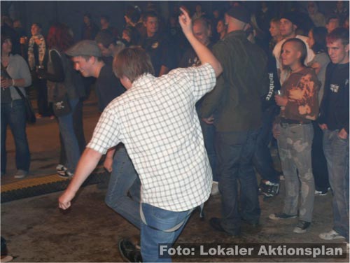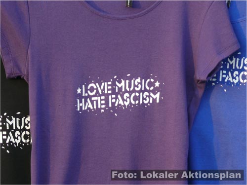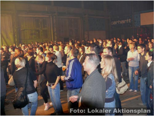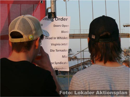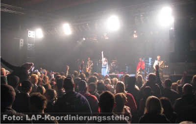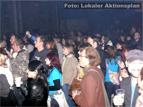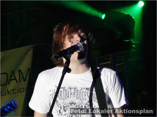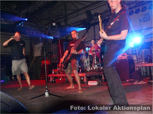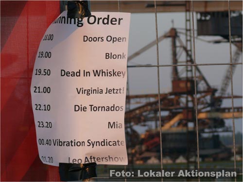„Wir wollen heute lauter sein als alle Nazis dieser Welt zusammen“Rock gegen Rechts-Festival in der Baggerstadt Ferropolis Gleich im Dutzend nahmen die Anhänger der Dessauer Hardcore- und Metalcombo „Blonk“ (mehr dazu hier...) die strapaziöse Anreise mit dem Fahrrad auf sich. Diese Konditionsübung stimmte dann auch gut auf die Verausgabung ein, mit der die vier jungen Herren aus der Brachialabteilung ihren Auftritt ablieferten. Wer die Jungs im Gründungsjahr 2004 gesehen hat kommt nicht umhin, dem Projekt ein erhebliche Entwicklung zu attestieren. Die einstige Garagenband hat sich spieltechnisch gemausert und ihren recht eigenen Sound kreiert, der im Internet schon einmal als „Screamo“ durchgeht. An der Angst vor den oftmals recht lautstarken und undefinierbaren Geräuschen von der Bühne kann es wohl nicht gelegen haben, dass zur Blonk-Attacke noch recht wenige Leute im Saal waren. Wohl schon eher an der recht uncoolen Zeit, zur der die Band den Reigen eröffnete. Aber vielleicht verspäteten sich ja einige Freunde und Freundinnen aus dem Umfeld, weil sie eine Panne mit dem Drahtesel hatten oder noch schlimmer: Kein Licht am Fahrrad. ![]() Blonk in action ![]() ![]() Nicht minder rockig ging es danach zu. „Dead in Whiskey“ (mehr dazu hier...) konnten klar von ihrem Heimvorteil profitieren, kommen die Mannen um Sänger Nico doch aus der der Heidestadt Gräfenhainichen, die kaum zwei Steinwürfe entfernt am Firmament noch zu erahnen ist. Die „G-Town Rebel`s“, wie sich die Formation in einem Anflug gesunder Selbstüberschätzung gern etikettiert , knallte den Hardcore nur so in den Saal. Doch auch Selbstironie scheint zu Repertoire der Band zu gehören: „Wir klingen nicht nur älter, wir sind es auch.“ Das Quartett hat aber noch mehr zu sagen und bezieht sich direkt auf das Anliegen des Events: „Wir sind heute hier um gemeinsam gegen die braune Brut zu kämpfen. Wir können Euch dabei musikalisch helfen.“ Auch deshalb hatte der Song „Together Forever“ wohl nichts mit Sozialromantik zu tun sondern geriet zum unmissverständlichen Aufruf, sich gemeinsam gegen rechte Gewalt zu engagieren und sich mit den Opfern dieser menschenfeindlichen Ideologie solidarisch zu erklären. Ein gewisser Selbstzweck, quasi die Ehrenrettung der Hardcore-Szene, steht für „Dead in Whiskey“ aber mindestens genau so auf der Agenda. Muss sich doch diese Jugendsubkultur ungewollter Umarmungsversuche der rechten Szene erwehren. Dort hat man den Stil und Habitus des Genres adaptiert und versucht unter dem Label „hatecore“ die Kids zu ködern. ![]() Band mit Heimvorteil: "Dead in Whiskey" ![]() einer der "G-Town-Rebel`s"... ![]() ... und noch einer... ![]() ...und gar ein Dritter ![]() "Barfuss gegen Rechts": der Sänger zeigt Bein In den Umbaupausen flimmern Kurzfilme über die Leinwand. Die versammelte Generation „You Tube“ wird jedoch nicht mit den neusten Handyklingeltönenabonnements belästigt und traktiert. Gezeigt werden Beiträge aus dem Videowettbewerb „Demokratische Welten“ (mehr dazu hier...). Die Filme, die im Rahmen eines vielbeachteten Projektes des Offenen Kanals Dessau in diesem Jahr entstanden sind, beschäftigen sich mit rassistischen Aus- und Abgrenzungsmechanismen und beleuchten die Lebenswirklichkeit von MigrantInnen in der Region Anhalt. ![]() ein klares und vor allem praktisches Bekenntnis... ![]() ...den Klamotten der bei Neonazis beliebten Modemarke "Thor Steinar" sind nicht erwünscht ![]() das Shirt zum Festival gabs gleich neben Infoständen... ![]() ...die Initiativen gegen Rechts in der Region vorstellten Die Zeit zwischen der nächsten Band und dem Weg zum Getränkewagen vertreiben sich derweil einige Gäste damit, sich am Stand des Alternativen Jugendzentrums (mehr dazu hier...) mit dem Festival-T-Shirt einzudecken oder Informationen über hiesige Initiativen gegen Rechts einzuholen. Andere nutzen das grandiose Wetter dazu, einen Bummel über das Ferropolis-Gelände zu wagen. Um entweder dem Charme dieses wohl einmaligen Industriedenkmals zu erliegen oder ganz profan einmal zu taxieren, was das hier ausgestellte Altmetall angesichts explodierender Schrottpreise heute auf dem Markt so wert ist. ![]() postindustrieller Charme, soweit das Auge reicht ![]() ![]() ![]() ![]() ... und ein Baggersee mit einer erstaunlichen Artenvielfalt Zurück an der Bühne, erwartet den geneigten Besucher nun ein musikalischer Kontrast. Die aufstrebende Indiepopband “Virgina Jetzt!“ (mehr dazu hier...) lässt die Fans zunächst an ihrem Lampenfieber teilhaben. Schließlich hat die Truppe eine einjähriger Bühnenabstinenz hinter sich, um an einem neuen Album zu schrauben und Kinder in die Welt zu setzen. Doch diese Sorge scheint unbegründet. Die seichten aber nie trivialen Songstrukturen sind vor allem auch dafür geeignet, die gesetzteren Semester in der Halle zum leichten Kopfwackeln und Fußwippen zu animieren. „Wir wollen heute lauter sein als alle Nazis dieser Welt zusammen“, bezieht das mit Mia. freundschaftlich verbundene Projekt eindeutig Position. „Virgina Jetzt!“, denen übrigens der Nimbus einer gewissen Tiefgründigkeit nachgesagt wird, setzten dabei konsequent auf deutsche Texte. Das Lied „Ich kann nicht wie die anderen“ kann dann wohl auch als Absage an Kollektivität und eine Hommage an die Individualität verstanden werden. Immerhin eine Grundvoraussetzung dafür, keine rechtsextremen Denk- und Handlungsmuster zu präferieren. Wer will, kann „Virgina Jetzt!“ übrigens zwischen laufenden Metern von Neuerscheinungen auf der diesjährigen Frankfurter Buchmesse live erleben. Dort sind die Musiker in Sachen „Lesemusikzimmer“ im Yachthafen der Stadt unterwegs. ![]() Virgina Jetzt! machten eher in seichten Tönen ![]() ![]() ![]() und das Publikum wurde so langsam warm... ![]() ..hatte augenscheinlich Spaß und das durchaus... ![]() ...generationsübergreifend Danach wird es auf der Bühne voller und im Saal lauter. Die „T