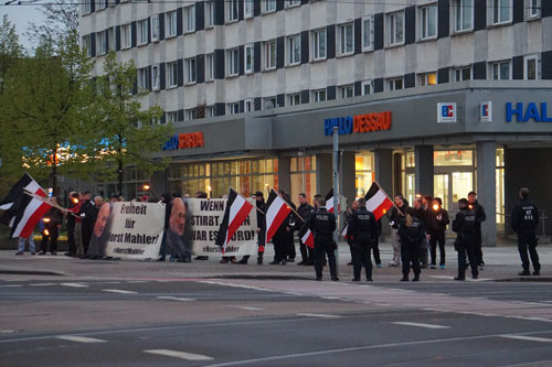 Im Nachgang einer neonazistischen Kundgebung in der Dessauer Innenstadt  unter dem Titel „Freiheit für Horst Mahler“ am 21. April 2017 hat das Projekt GegenPart heute Strafantrag und Strafanzeige wegen des Verstoßes gegen das Versammlungsgesetz erstattet. Circa 25 Neonazis aus der kreisfreien Stadt Dessau-Roßlau , aus den Landkreisen Anhalt-Bitterfeld, Wittenberg, dem Salzlandkreis sowie den kreisfreien Halle (Saale) und Magdeburg  hatten sich gegen 19.50 Uhr im Dessauer Stadtzentrum im Bereich der Museumskreuzung versammelt. Darunter Akteure der „Freien Nationalisten Dessau“, der „Brigade Halle Saale“, der „Brigade Magdeburg“  und der „Brigade Bitterfeld / Nationales Kollektiv Anhalt“, die sich mit zwei ausgebreiteten Bannern sowie  Schwarz-Weiß-Roten-Fahnen und entzündeten Fackeln entlang der Franzstraße/Ecke Askanische Straße positionierten.