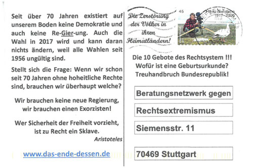 Bei der Mobilen Beratung gegen Rechtsextremismus in Anhalt geht per Mail eine Postkarte mit verschwörungsideologischem Inhalt ein. Im Duktus von "Reichsideologie" (mehr dazu hier...) (und hier...) wird dabei die Existenz der Bundesrepublik Deutschland geleugnet, unter anderem mit den Worten: "Seit über 70 Jahren exisitiert auf unserem Boden keine Demokratie und auch keine Re-Gier-ung. Auch die Wahl in 2017 wird und kann daran nichts ändern, weil alle Wahlen seit 1956 ungültig sind."
