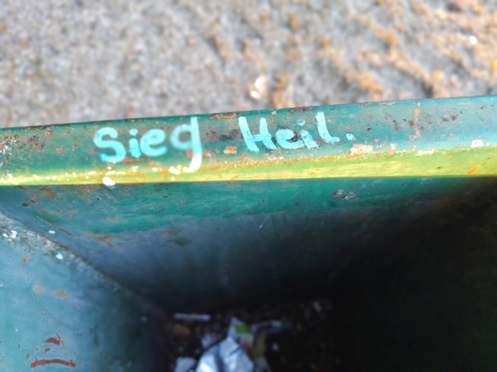 An einem Papierkorb auf dem Akener Nikolaiplatz im Bereich des Spielplatzes wird ein Hakenkreuz nebst der Parole „Sieg Heil“ und der rechtsextreme Zahlencode „88“ festgestellt. Die inkriminierten Symbole wurden dabei offenbar mit einem weißen Permanentmarker aufgetragen. Entsprechende Strafanzeigen wurden erstattet, der polizeiliche Staatsschutz ermittelt. In der Kleinstadt an der Elbe kommt es immer wieder zu ähnlich gelagerten Delikten (mehr dazu hier… und hier… und hier…).