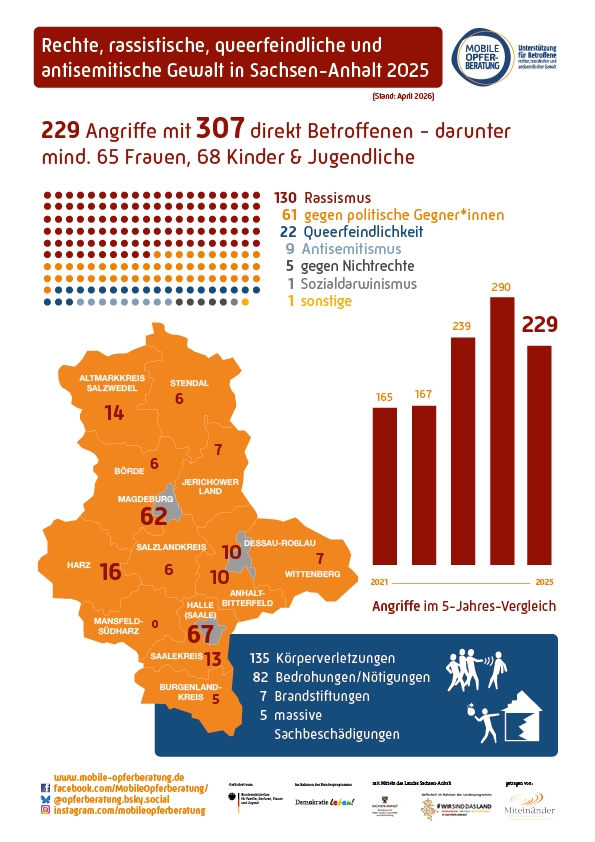 229 rechte, rassistische, antisemitische und queerfeindliche Angriffe mit 307 direkt Betroffenen hat die Mobile Opferberatung für das Jahr 2025 in Sachsen-Anhalt dokumentiert. Damit gab es im vergangenen Jahr statistisch gesehen vier bis fünf rechte Angriffe pro Woche. Im Verhältnis zur Bevölkerungszahl von 2,1 Millionen Menschen werden somit in Sachsen-Anhalt mit 6,7 rechten Angriffen pro 100.000 Einwohner*innen etwa drei Mal so viele rechte Gewalttaten verübt wie im Durchschnitt in den westdeutschen Flächenländern. Der Rückgang bei der Gesamtzahl der Angriffe im Vergleich zum Vorjahr von rund 20 Prozent (2024: 290) ist kein Anlass zur Entwarnung. Dies zeigt u.a. der Anstieg bei Angriffen gegen politische Gegner*innen.