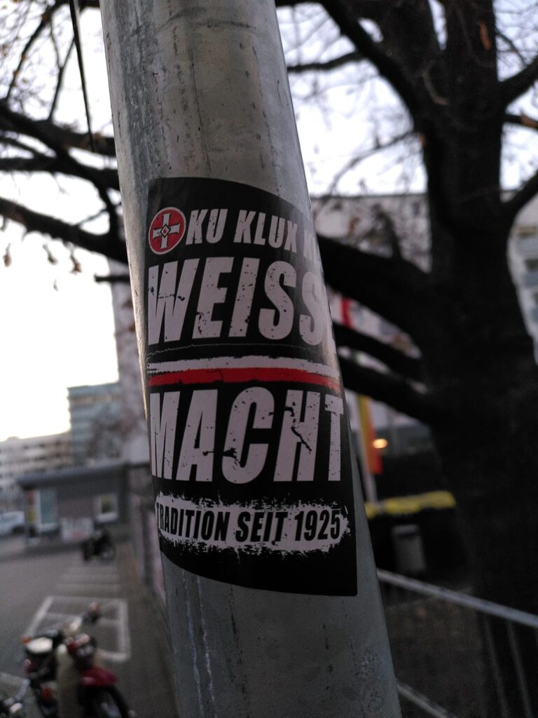 In der Nähe des AZ (Alternatives Zentrum) in der Dessauer Innenstadt werden gleich mehrere neonazistische Propagandaträger entdeckt. Auf Grund der räumlichen Nähe zum AZ ist dabei von einer gezielten Provokation auszugehen. Auf dem einem Aufkleber ist eine stilisierte Karte des Deutschen Reiches in den Grenzen von 1937 zu sehen, versehen mit der Parole „Das ganze Deutschland soll es sein“. Dieses Motiv ist demnach ausschließlich in einschlägigen, rechtsextremen Internetversänden wie „Druck 18“ zu beziehen. Überdies wurde ein rassistischer Aufkleber mit dem Spruch „Ku Klux Klan – Weisse Macht – Tradition seit 1925“ festgestellt. Dieses Motiv gibt es u. a. beim Neonaziversand „Druck 88“. Komplettiert wird die neonazistische Propagandareihung durch einen Aufkleber, der Bundeskanzler Olaf Scholz, Außenministerin Annalena Baerbock, Finanzminister Christian Lindner und Wirtschaftsminister Robert Habeck in despektierlicher Pose unter dem Spruch „Wir haben die unfähigste Regierung der Welt“ zeigt. Auch dieser Aufkleber ist bei „Druck 88“ im Angebot.