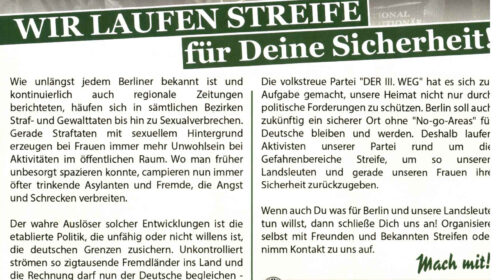 In der Köthener Innenstadt werden mehrere Aufkleber mit dem Motiv der so genannten „Schwarzen Sonne“ festgestellt. Die „Schwarze Sonne“ ist eins der beliebtesten Symbole in der extrem rechten Szene. Anders als zu vermuten, ist das Symbol dabei ein Kunstgebilde der nationalsozialistischen SS. Auf der Wewelsburg – einem Hauptkultplatz der SS – war die „Schwarze Sonne“ dort als großes Bodenrelief eingelassen. Die im Hintergrund des Aufklebers verwendete Farbkombination Schwarz-Weiß-Rot hat zudem in der rechtsextremen Ikonographie eine ideologisch aufgeladene Bedeutung. Aus der Bezugnahme auf die Fahne des preußisch dominierten deutschen Kaiserreichs lässt sich die Ablehnung der liberal-demokratischen gesellschaftlichen Modernisierung herauslesen.