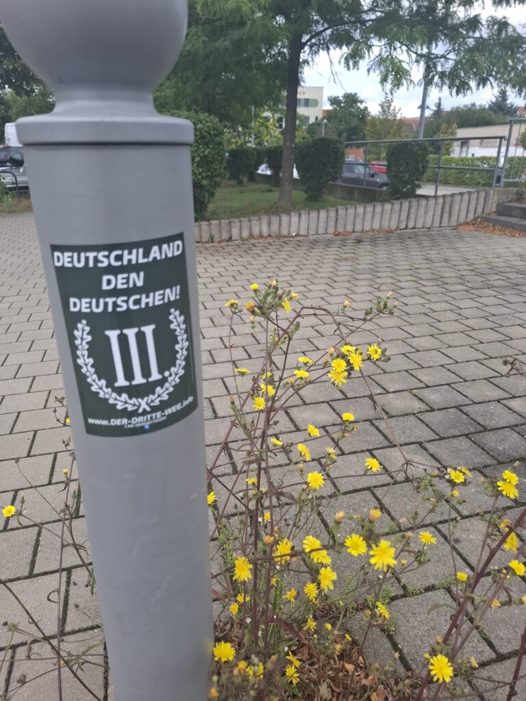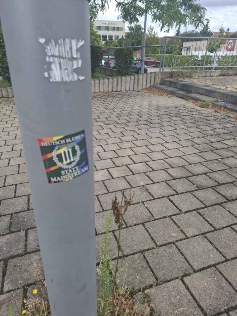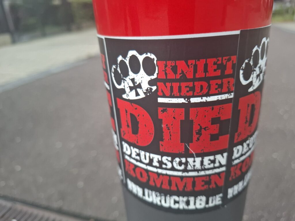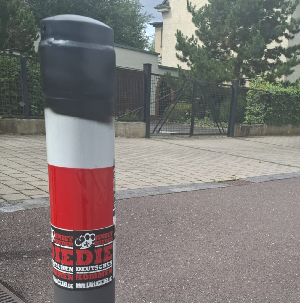 Just an dem Tag, als der Verein Buntes Roßlau die 9. Auflage des Demokratiefestes „Roßlau rockt für Vielfalt und Toleranz“ (mehr dazu hier…) auf dem hiesigen Schillerplatz durchführt, werden dort und in der unmittelbaren, räumlichen Nähe Dutzende neonazistische Aufkleber und einige rechtsextreme Graffiti festgestellt. Dies verwundert kaum, hatte doch die neonazistische Kleinstpartei „Der III. Weg“ im Stile eine Raumnahmestrategie nur zwei Tage zuvor im Netz gegen das Fest gehetzt (mehr dazu hier…). Der Aufkleber mit dem Motiv „Kniet nieder, die Deutschen kommen“ visualisiert mit einem abgebildeten Schlagring nicht nur einen unverhohlenen Aufruf zur Gewalt, sondern wurde vor kurzem schon einmal zur Einschüchterung der Demokratieinitiative verwendet (mehr dazu hier…). Bemerkenswert ist zudem der vorgefundene Klebeort dieses Aufklebers, mithin ein ursprünglich weiß-rot gestreifter Verkehrspoller, der mittels Sprühfarbe noch mit einer schwarzen Farbkomponente versehen wurde. Die Farbkombination schwarz-weiß-rot ist in der extrem rechten Szene ideologisch aufgeladen (mehr dazu hier…) und findet auf vielen neonazistischen Devotionalien und Produkten (Aufkleber, Modemarken, Plattencover, Videos auf TikTok etc.) als Erkennungsmerkmal nach Innen (Binnenidentität) und als Botschaft nach Außen (Raumnahme) Anwendung. Dieser Logik folgt auch das Motiv „FCK Antifa“, dass zusammen mit dem chauvinistisch-nationalistischen Aufkleber „Du – Deutsche voran!“ und „Ich bin als Deutscher geboren und schulde dem Rest der Welt einen Scheiß“ genauso auf dem Schillerplatz entdeckt wurde, wie die rassistische Botschaft „Abschieben verhindert Straftaten“, die geschichtsrevisionistische Parole „Befreie Dich vom Schuldkult“ (mehr dazu hier…) oder einem Aufkleber, der für die neonazistische Band „Sleipnir“ Werbung macht (mehr dazu hier…). Daneben konnten gleich an Dutzenden Klebeorten mehrere Motive mit Bezug zur Kleinstpartei „Der III. Weg“ festgestellt werden, so die Aussage „Pädophilie bekämpfen – Schützt die Kinder“, die durch die Hinzunahme von Regenbogen eine homphobe Aufladung erfährt, die nationalistische Parole „Deutschland den Deutschen“ (mehr dazu hier…), die antisemitisch aufgeladene Aussage „Keine Solidarität mit Israel!“, die systemfeindliche Botschaft „Deutsch bleiben statt Mainstream“ (mehr dazu hier…) oder „Führt Euern Körper Hart, Sauber und Gesund“ (mehr dazu hier…). Komplettiert wird die Raumnahme durch neonazistische Graffitis wie den Zahlencode „1161“ (mehr dazu hier…) und einem sogenannten Kelten- oder Heidenkreuz, dass in der extrem rechten Szene u. a. mit der rassistischen Botschaft „White Power“ assoziiert ist (mehr dazu hier…).