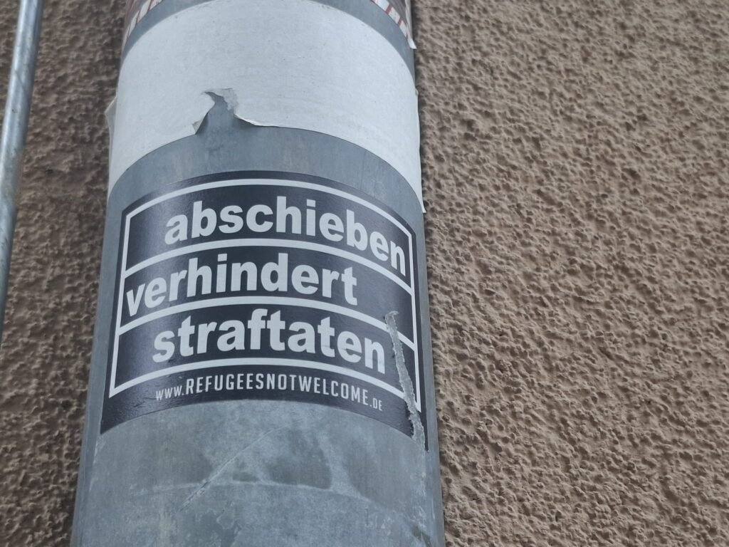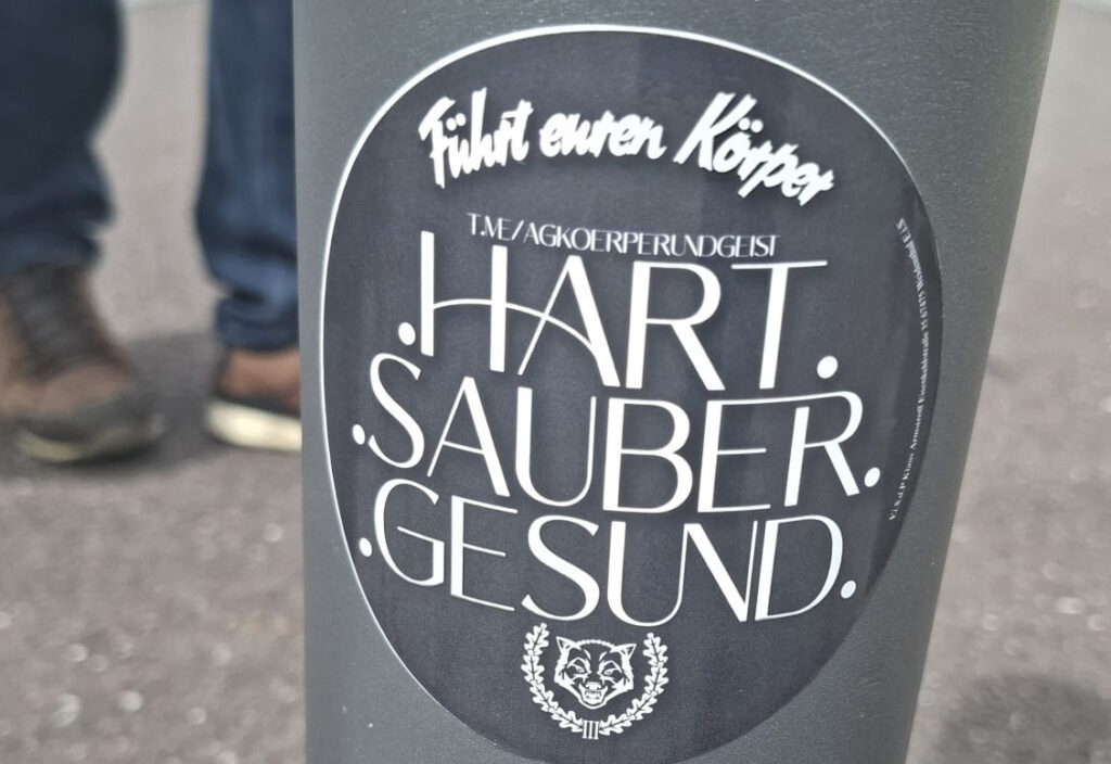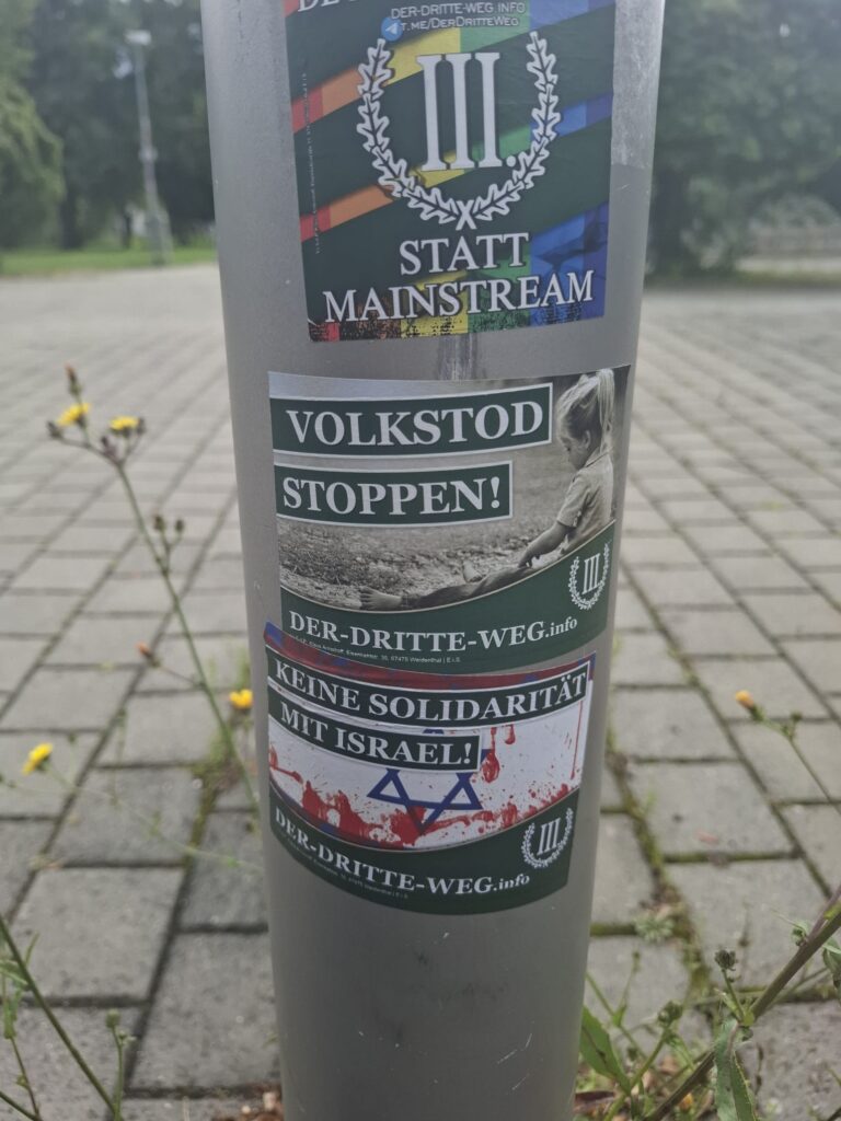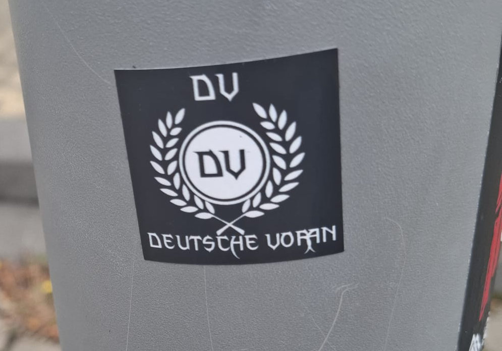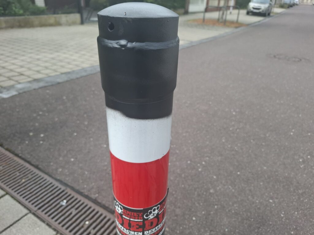 Just an dem Tag, als der Verein Buntes Roßlau die 9. Auflage des Demokratiefestes „Roßlau rockt für Vielfalt und Toleranz“ (mehr dazu hier…) auf dem hiesigen Schillerplatz durchführt, werden dort und in der unmittelbaren, räumlichen Nähe Dutzende neonazistische Aufkleber und einige rechtsextreme Graffiti festgestellt. Dies verwundert kaum, hatte doch die neonazistische Kleinstpartei „Der III. Weg“ im Stile eine Raumnahmestrategie nur zwei Tage zuvor im Netz gegen das Fest gehetzt (mehr dazu hier…). Der Aufkleber mit dem Motiv „Kniet nieder, die Deutschen kommen“ visualisiert mit einem abgebildeten Schlagring nicht nur einen unverhohlenen Aufruf zur Gewalt, sondern wurde vor kurzem schon einmal zur Einschüchterung der Demokratieinitiative verwendet (mehr dazu hier…). Bemerkenswert ist zudem der vorgefundene Klebeort dieses Aufklebers, mithin ein ursprünglich weiß-rot gestreifter Verkehrspoller, der mittels Sprühfarbe noch mit einer schwarzen Farbkomponente versehen wurde. Die Farbkombination schwarz-weiß-rot ist in der extrem rechten Szene ideologisch aufgeladen (mehr dazu hier…) und findet auf vielen neonazistischen Devotionalien und Produkten (Aufkleber, Modemarken, Plattencover, Videos auf TikTok etc.) als Erkennungsmerkmal nach Innen (Binnenidentität) und als Botschaft nach Außen (Raumnahme) Anwendung. Dieser Logik folgt auch das Motiv „FCK Antifa“, dass zusammen mit dem chauvinistisch-nationalistischen Aufkleber „Du – Deutsche voran!“ und „Ich bin als Deutscher geboren und schulde dem Rest der Welt einen Scheiß“ genauso auf dem Schillerplatz entdeckt wurde, wie die rassistische Botschaft „Abschieben verhindert Straftaten“, die geschichtsrevisionistische Parole „Befreie Dich vom Schuldkult“ (mehr dazu hier…) oder einem Aufkleber, der für die neonazistische Band „Sleipnir“ Werbung macht (mehr dazu hier…). Daneben konnten gleich an Dutzenden Klebeorten mehrere Motive mit Bezug zur Kleinstpartei „Der III. Weg“ festgestellt werden, so die Aussage „Pädophilie bekämpfen – Schützt die Kinder“, die durch die Hinzunahme von Regenbogen eine homphobe Aufladung erfährt, die nationalistische Parole „Deutschland den Deutschen“ (mehr dazu hier…), die antisemitisch aufgeladene Aussage „Keine Solidarität mit Israel!“, die systemfeindliche Botschaft „Deutsch bleiben statt Mainstream“ (mehr dazu hier…) oder „Führt Euern Körper Hart, Sauber und Gesund“ (mehr dazu hier…). Komplettiert wird die Raumnahme durch neonazistische Graffitis wie den Zahlencode „1161“ (mehr dazu hier…) und einem sogenannten Kelten- oder Heidenkreuz, dass in der extrem rechten Szene u. a. mit der rassistischen Botschaft „White Power“ assoziiert ist (mehr dazu hier…).