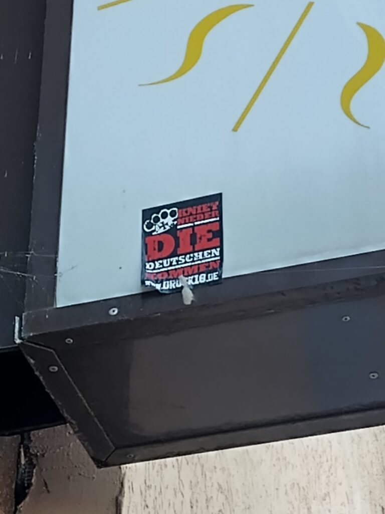 In der Dessauer Innenstadt wird ein Aufkleber mit dem Motiv „Kniet nieder – Die Deutschen kommen“ festgestellt. Der Aufkleber zeigt dabei einen stilisierten Schlagring und kann nur als unverhohlener Aufruf zur Gewalt verstanden werden. Das Motiv (mehr dazu hier…), dass u. a. auf dem neonazistischen Internetportal „Druck 18“ zu beziehen ist, wurde in der Doppelstadt indes nicht das erste Mal registriert.