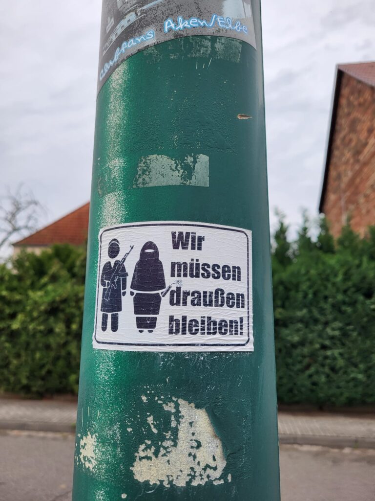 In der Ritterstraße wird an einer Laterne ein Aufkleber mit der rassistischen Parole „Wir müssen draußen bleiben“ entdeckt. Das ursprünglich einmal für Hunde gedachte Begehungsverbot (u. a. in Geschäften) zeigt die ganze Menschenverachtung der extrem rechten Szene.  Abgebildet ist eine Frau in einer stilisierten Burka, die in Gestalt einer  bewaffneten islamistischen Terroristin daherkommt. Das Motiv ist u. a. auf der neonazistischen Plattform „defend europe“ zu beziehen. Dort gibt es zahlreiche, NS-relativierende oder gewaltverherrlichende Devotionalen und Kleidungsstücke.