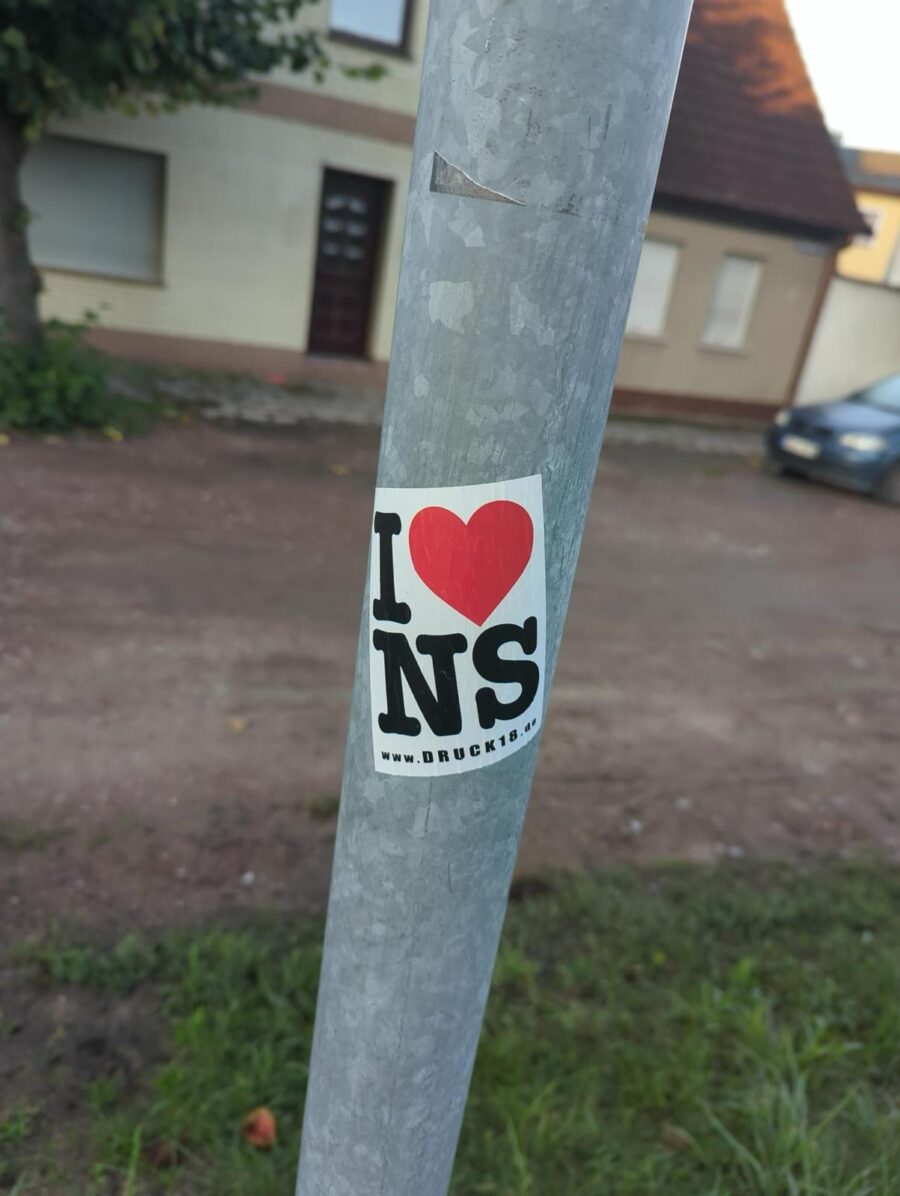 An einer Bushaltestelle in der Dessauer Chaussee wird ein Aufkleber mit der Parole „I love NS“ entdeckt, eine unumwundene Glorifizierung des historischen Nationalsozialismus und damit eine Verhöhnung aller NS-Opfer. Zu beziehen ist der Aufkleber ausschließlich über die neonazistische Website „Druck 18“.