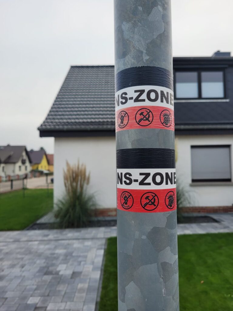 Erneut wird im Akener Amselweg ein neonazistischer Aufkleber mit dem Kürzel „NS-Zone“ festgestellt, ein offensichtlich positiver Bezug zum historischen Nationalsozialismus. Dafür spricht auch die verwendete Farbkombination Schwarz-Weiß-Rot die in der rechtsextremen Ikonographie eine ideologisch aufgeladene Bedeutung hat. Die durchgestrichenen Piktogramme reihen sich in diese Bildsprache ein. So soll die „Black Lives Matter“ – Bewegung diskreditiert werden oder sich mit durchgestrichenen „Punker“ gegen alle Jugendsubkulturen die nicht rechts sind, ausgesprochen werden. Interpretationswürdig ist das Hammer und Sichel-Symbol. Hier ist nicht davon auszugehen, dass damit nur im engsten Sinne die politische Feindschaft zu vermeintlichen oder tatsächlichen kommunistischen Gruppierungen oder Bewegungen zum Ausdruck kommt. Vielmehr herrscht in der extrem rechten Szene mit einem verkürzten Freund-Feind-Schema der Duktus vor, dass alle die nicht für neonazistische Ideologiefragmente eintreten, der Feind sind. In diesem Zusammenhang kann auch von einer rechtsextremen Opferinszenierung, einer Selbstviktimisierung gesprochen werden. Das schließt in dieser Logik dann nicht nur klassische linke Gruppen ein, sondern das gesamte „verhasste System“ – von der CSU bis zur Linkspartei oder von den Gewerkschaften bis zu den Kirchen. Dieser Aufkleber ist in einschlägigen, neonazistischen Internetversänden wie bspw. „Druck88“ zu beziehen. Zuletzt wurde dieses Aufklebermotiv in Aken vor einem Monat festgestellt (mehr dazu hier…).