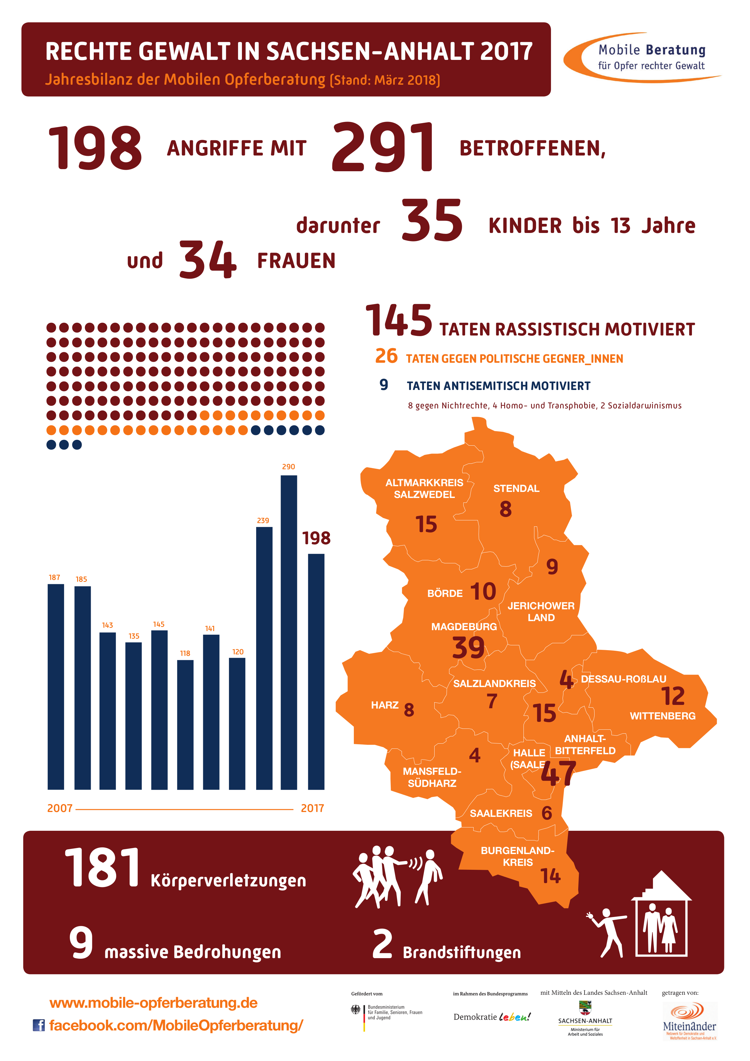 198 politisch rechts motivierte Gewalttaten mit 291 direkt Betroffenen hat die Mobile Opferberatung für das Jahr 2017 in Sachsen-Anhalt registriert. Dies ist die dritthöchste Zahl rechter Gewalttaten in den letzten zehn Jahren. „Es gibt nach der massiven Zunahme in den beiden Vorjahren (2015: 217, 2016: 265 Angriffe im Vergleichszeitraum) trotz eines Rückgangs keinen Anlass zur Entwarnung“, so eine Sprecherin der Mobilen Opferberatung. 73 Prozent der Angriffe (145) waren rassistisch motiviert. Damit ist deren Anteil an der Gesamtzahl sogar noch weiter gestiegen.