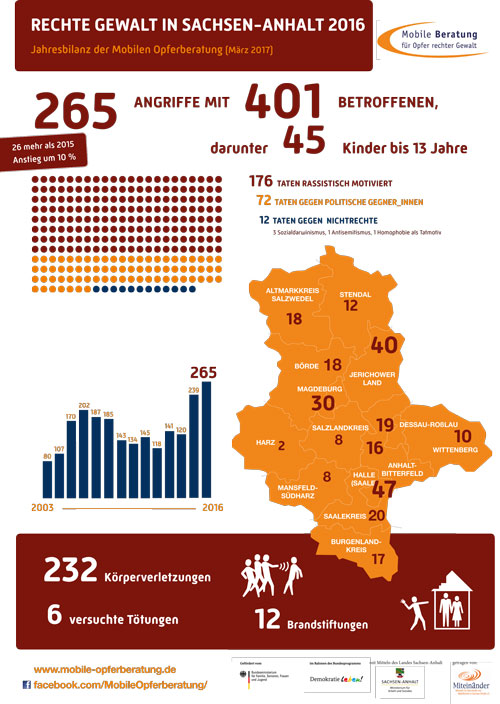 265 politisch rechts motivierte Gewalttaten mit 401 direkt davon betroffenen Menschen hat die Mobile Opfer-beratung für das Jahr 2016 in Sachsen-Anhalt registriert. Damit hat sich die Zahl der bekannt gewordenen politisch rechts und rassistisch motivierten Angriffe im Vergleich zu 2015 erneut erhöht. So hatte die Mobile Opferberatung im März 2016 für das Jahr 2015 217 Angriffe bekannt gegeben und damit eine Verdopplung im Vergleich zu 2014 konstatieren müssen.