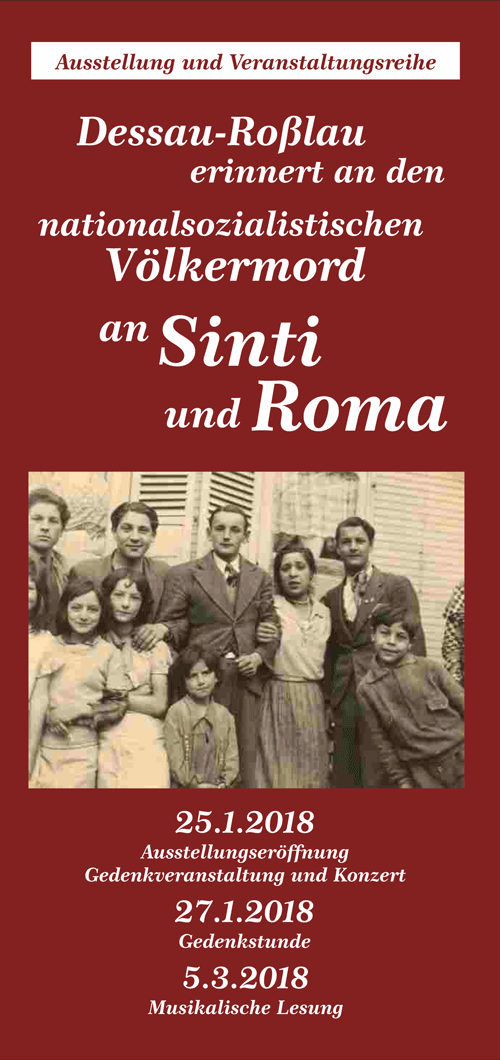 Anfang Januar 1938 verfügte die Geheime Staatspolizei ein Aufenthaltsverbot für „Zigeuner“ in Dessau-Roßlau und ganz Anhalt. Infolge wurden mehrere Sintifamilien, die im Triftweg und in der Mittelfeldstraße in Roßlau lebten, in das „Zigeunerlager am Holzweg“ in Magdeburg gezwungen. Fünf Jahre später, Anfang März 1943, erfolgte die  Deportation derjenigen aus Magdeburg, die bis dahin noch nicht in Konzentrationslager verschleppt worden waren, nach Auschwitz. Die Mehrheit der mitteldeutschen Sinti und Roma fiel dem nationalsozialistischen Völkermord zum Opfer. Mit einer Veranstaltungsreihe möchten die Stadt Dessau-Roßlau und das Alternative Jugendzentrum e.V. Dessau an diese Männer, Frauen und Kinder erinnern und ihrer gedenken.