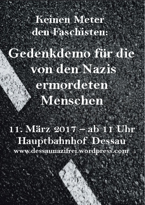 "Im März 2017 denken wir in Dessau wieder an die schrecklichen Verbrechen in der Zeit des Nationalsozialismus von 1933 bis 1945. Mit der Bombardierung und massiven Zerstörung der Stadt, die sich in diesem Jahr zum 72. Mal jährt, kehrte der Terror des von Deutschland begonnenen Weltkrieges auch nach Dessau zurück. Rechte Kameradschaften wollen in diesem Zeitraum mit ihrem Zug durch unser Zentrum erneut den wahren Geschichtsverlauf leugnen und ihre menschenfeindlichen Parolen skandieren. Zudem haben rechtsextrem motivierte Aufmärsche, Straftaten und Drohungen gegen Menschen, die sich für eine offene Gesellschaft engagieren, in den letzten Monaten sprunghaft zugenommen. Dem wollen wir uns  mit gemeinsamen, bunten, friedlichen und alle Menschen ansprechenden Aktionen entgegenstellen."