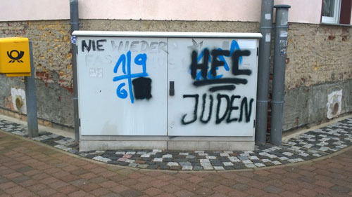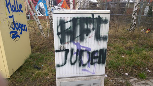 Die Mobile Beratung gegen Rechtsextremismus hat Strafanzeige wegen (antisemitischer) Volksverhetzung (§130 StGB) gegen Unbekannt erstattet. Am 09. Februar und 11. Februar 2016 wurden mehrere rechte Graffitis im Kontext von rivalisierenden Fußballfans mit antisemitischem Inhalt festgestellt. Der Schriftzug „Jagt HFC Juden“ bzw. „HFC Juden“ wurde an folgenden Orten vorgefunden: Nikolaiplatz (Garage), Silberstraße/ Ecke Ritterstraße (Stromkasten), Ritterstraße/ Ecke Gartenstraße.