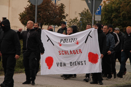 Zu einer für 100 bis 200 Personen angemeldeten Demonstration erschienen am Bitterfelder Bahnhof dann rund 30 Personen aus dem rechtsextremen Spektrum, welche augenscheinlich den Fußballfanszenen vom Halleschen FC und Lokomotive Leipzig nahe stehen.