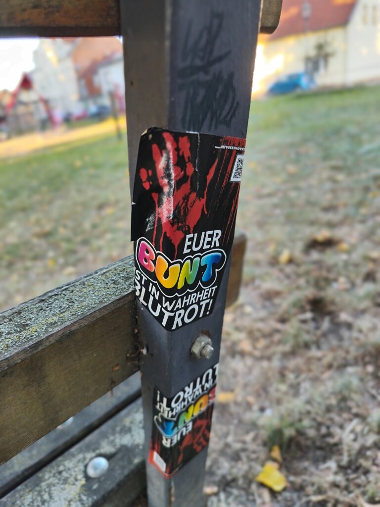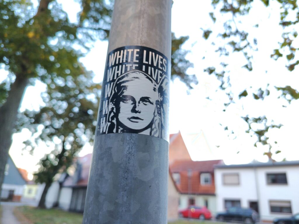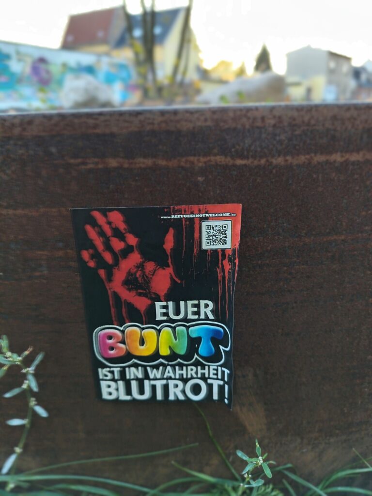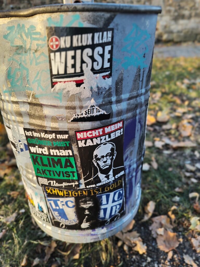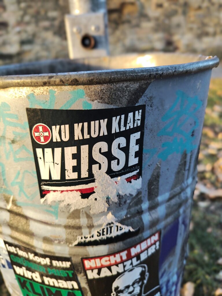 Im Umfeld des Akener Nikolaiplatzes wurde auf einem Spielplatz ein ganzes Konvolut von rechtsextremen Aufkleber an zusammen 10 Klebeorten entdeckt. So steht das Motiv „Ku Klux Klan – White Power“ für eine Glorifizierung des rassistischen, antisemitischen und gewalttätigen Geheimbundes aus den USA. Der Aufkleber mit der rassistischen Aufschrift „White Lives Matter“ ist nicht nur als Diskreditierung und Verballhornung der US-amerikanischen Bewegung „Black Lives Matter“ zu verstehen, sondern erinnert in der verwendeten Bildsprache und Ikonographie an Vorlagen aus dem historischen Nationalsozialismus. Motive wie „Weiß ist bunt genug“ oder die Parole „Euer Bunt ist in Wahrheit Blutrot“ verfügen über einen offensichtlich ethnozentrischen wie rassistischen Gehalt, wobei bei letzterem noch die extrem rechte und bei Verschwörungsideologen aller Couleur beliebte Opfererzählung vom „Großen Austausch“ (Great Reset) (mehr dazu hier…) hinzukommt. Die klimaleugnende Erzählung der Parole „Ist im Kopf nur grüner Mist, wird man Klimaaktivist“ und der rassistische Aufkleber „Thank You for not Mixing“ (mehr dazu hier…) ergänzen das braune Konvolut ebenso, wie der Aufkleber „Nicht mein Kanzler! Nie wieder CDU!“, der das Konterfei von Friedrich Merz zeigt. Hierbei geht es nicht nur darum, das Engagement demokratischer Parteien pauschal verächtlich zu machen, sondern im Subtext die Systemfrage aus einer neonazistischen Perspektive zu stellen. Denn die extrem rechte Szene will in letzter Konsequenz den demokratischen Rechtsstaat abschaffen und durch ein autoritäres Regime nach dem Vorbild der nationalsozialistischen Herrschaft ersetzen. Dem Aufkleber „Talahons abschieben“ ist der rassistische Gehalt schon in seiner Ikonographie anzusehen. Bemerkenswert ist indes die rechtsextreme Aneignung dieses Begriffs. „Talahons“ ging eigentlich aus einem Trend auf der Plattform „TikTok“ hervor und kam 2024 sogar in die Endauswahl zum „Jugendwort des Jahres“. Der TikTok-Trend bestand vor allem darin, dass sich männliche Jugendliche mit Migrationsbiographie, durchaus nicht immer erstgemeint, im Macho- und Gangsterpossen oder beim Schattenboxen und Liegestützten in westdeutschen Großstädten filmten. Einige Medien, ob berechtigt oder nicht, rezipierten diesen Trend dann schließlich als in Teilen frauenfeindlich und sexistisch. Dieses Narrativ, freilich ohne die notwendige Differenzierung, übernahmen schließlich Rechtsextremisten und versuchen seit her nicht ohne Erfolg, den Trend und den Begriff für eine jugendliche Zielgruppe popkulturell-rassistisch aufzuladen.
