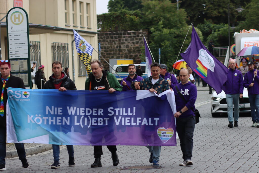 Am Rande des 2. CSD in Köthen kam es nur vereinzelt zu Provokationen. Der Polizei gelang es demnach, potentielle rechte Störer:innen erst gar nicht in die Nähe des Aufzuges zu lassen. Im letzten Jahr kam es beim CSD in der Bachstadt zu drei Körperverletzungsdelikten, mehreren Beleidigungen und Bedrohungen, einem Buttersäureanschlag und mehreren homophoben und queerfeindlichen Graffiti entlang der Strecke (mehr dazu hier… und hier… und hier…). Laut Medienberichten nahmen an dem Christopher Street Day 300 Menschen teil. Wie der X-Kanal „fluxus“ vorab öffentlich machte, hat der Berliner Tagesspiegel darüber berichtet, dass die Polizei jungen Neonazis der Gruppierung „Deutsche Jugend zuerst“ aus Halle/Saale in einer Gefährderansprache Auflagen erteilt hätten. Demnach hätten sich die Rechtsextremisten am 12. Juli 2025 in der Zeit zwischen 14.00 und 18.00 Uhr – also just zum Zeitpunkt des CSD in der Bachstadt – im Polizeirevier Halle melden müssen. Im Vorfeld gab es zudem Streit zwischen den Organisator:innen und der zuständigen Ordnungsbehörde. Es ging u. a. um den Standort von Toiletten- und Imbisswagen. Schließlich zogen die CSD-Macher:innen vor das Verwaltungsgericht und bekamen Recht.