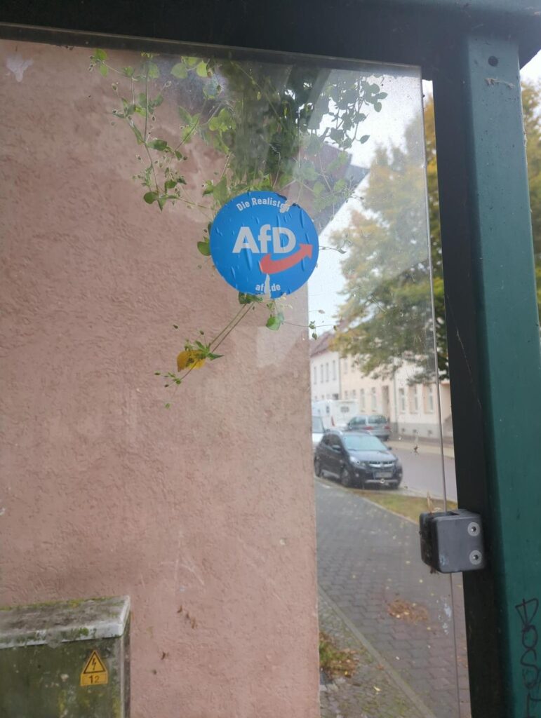 An der Bushaltestelle „Grundschule“ in der Akener Burgstraße wird ein Aufkleber mit der Aufschrift „AfD – Die Realisten“ dokumentiert. Positive Bekenntnisse zur in Sachsen-Anhalt vom hiesigen Verfassungsschutz als „gesichert rechtsextreme Bestrebung“ eingestuften Partei werden in der Kleinstadt an der Elbe immer wieder festgestellt (mehr dazu hier…und hier… und hier…).