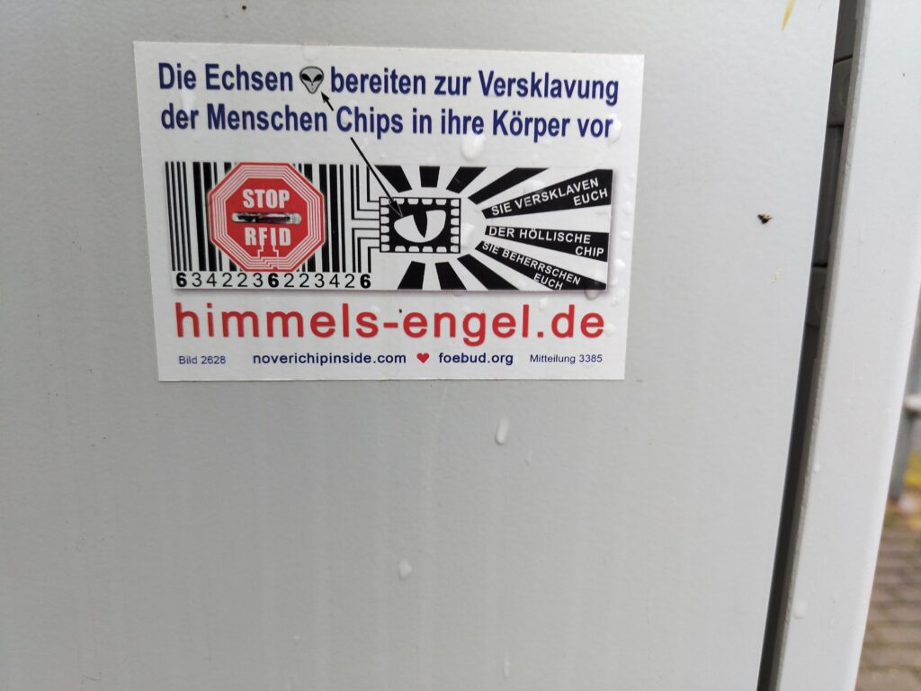 An einem Stromkasten in Dessau-Kochstedt wird ein Aufkleber mit der Aufschrift „Die Echsen bereiten zur Versklavung der Menschen Chips in ihre Körper vor“ festgestellt. Die darauf ausgewiesene Homepage verweist auf die verschwörungsideologische Gruppierung „Himmelsengel“. Dort finden sich in mehreren Sprachen krudeste Verschwörungserzählungen, u. a. die von den „Echsenmenschen“, zudem wird von einem „Großen Plan alle Menschen zu chippen“ schwadroniert. Insbesondere die Verschwörungserzählung von den „Echsenmenschen“, auch Reptiloiden genannt, ist strukturell antisemitisch. Wird doch daran geglaubt, dass diese „Spezies“ seit Jahrhunderten auf der Erde im Untergrund lebe und insgeheim die Geschicke von Staaten, Regierungen oder Wirtschaftsunternehmen lenke (mehr dazu hier…). Solche Propagandaträger sind in der Doppelstadt nicht das erste Mal aufgetaucht (mehr dazu hier…und hier…und hier…und hier…).