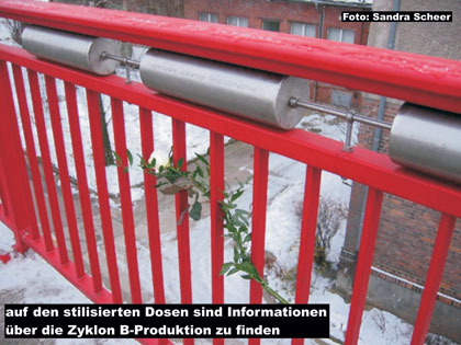 Am 27. Januar 2005, dem 60. Jahrestag der Befreiung des deutschen Vernichtungslagers Auschwitz-Birkenau, wurde in Dessau auf der Brauereibrücke (Askanische Str.) der Informations- und Mahnpunkt Zyklon B der Öffentlichkeit übergeben. Nach jahrelangen Bemühungen und zum Teil gegen heftige politische Widerstände, ist es den Initiatoren um die Forschungsgruppe Zyklon B Dessau gelungen, dieses Projekt Wirklichkeit werden zu lassen. Diese Umsetzung geschah in enger Kooperation mit der Designerin Sandra Scheer, die für die Gestaltung des Info- und Mahnpunktes verantwortlich zeichnet. Die konzeptionell gewollte Doppelfunktion, war und ist den MacherInnen dabei sehr wichtig. Informieren möchte der Mahnpunkt über die Produktion des Giftgases in Dessau. Mahnend möchte der Informationspunkt daran erinnern, dass mit diesem eigentlich zur Schädlingsbekämpfung entwickelten Produkt, in den nationalsozialistischen Vernichtungslagern Millionen Menschen fließbandmäßig ermordet wurden.