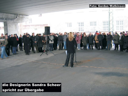 Sandra Scheer wünschte sich vor allem, das die Dessauer und DessauerInnen den Info- und Mahnpunkt wirklich annehmen und ihn nicht beschädigen. Genau dies, so Scheer weiter, sei kurz vor der Übergabe bereits passiert. Unbekannte hatten einige der am Brückengelände angebrachten und zur Gesamtinstallation gehörenden Reflektoren gewaltsam entfernt.