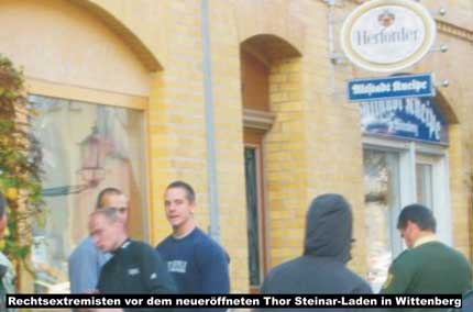 In der Pfaffengasse eröffnete unter dem Label "Rodberg-Store" ein Bekleidungsgeschäft, dass die Modemarke "Thor Steinar" zum Kauf anbietet. "Thor Steinar" ist nicht nur durch völkische Symbolik mit NS-Bezug gekennzeichnet, sondern äußerst attraktiv für Rechtsextremisten und Neonazis. Es verging in der letzten Zeit in der Region kaum ein Neonazi-Aufmarsch, bei dem die Marke »Thor Steinar« nicht auffällig präsent war. Im benachbarten Dessau (mehr dazu hier...) protestierten vor einiger Zeit mehrere zivilgesellschaftliche AkteurInnen gegen ein Geschäft im Dessauer Rathaus-Center, dass "Thor Steinar"-Produkte ebenfalls verkauft. Auch der Landtag Sachsen-Anhalts beschäftigte sich bereits mit diesem Thema (mehr dazu hier...). Gegen die Eröffnung demonstrierten in der Lutherstadt spontan 40 nichtrechte Jugendliche. Ein anwesender Augenzeuge berichtete zudem, dass ein Polizeibeamter des Dessauer Fachkommissariats 4 gegen einen Rechtsextremisten Strafanzeige wegen des Zeigens des sogenannten "Kühnengrußes" erstattete. Darüber hinaus erhielt ein antifaschistischer Gegendemonstrant im Nachgang der Kundgebung ein SMS, in der er mit den Worten: "(...) wenn Du jetzt so weiter machst, sehe ich für Dich schwarz (...)", unverhohlen bedroht wurde.