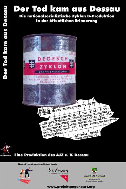 18.30 Uhr Filmpremiere: „Der Tod kam aus Dessau – Die nationalsozialistische Zyklon B-Produktion in der öffentlichen Erinnerung“ >>>> Mit dem Schädlingsbekämpfungsmittel Zyklon B ermordeten die Nationalsozialisten in den deutschen Vernichtungslagern Millionen von Menschen, vor allem europäische Juden. Dessau war der Hauptproduktions- standort von Zyklon B. Bis 1945 wurde das Giftgas in der Zuckerraffinerie, im Volksmund "Fine" genannt, hergestellt. Die 30minütige Dokumentation beleuchtet die lokalen Aspekte der Produktion und geht der Frage nach, ob und wie sich die Dessauer nach 1945 mit dem historischen Fakt, dass ein Produkt aus ihrer Stadt zur Menschenvernichtung verwendet wurde, auseinandersetzten. Der Film nähert sich sowohl der öffentlichen Erinnerung in der DDR als auch der Debatte nach der politischen Wende 1989. Neben der Befragung von Interviewpartnern, kommen die Überlebenden Henryk Mandelbaum und Kazimierz Smolen zu Wort.
