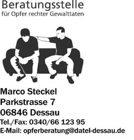 Veranstalter: Projekt gegenPart Netzwerkstelle gegen Rechtsextremismus, Fremdenfeindlichkeit und Antisemitismus Steffen Andersch Schlachthofstr. 25 06844 Dessau Tel./Fax: 0340/ 26 60 21 3 projektgegenpart@gmx.net www.projektgegenpart.org