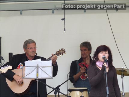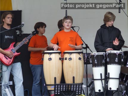 Von diesen Provokationen von Rechts ließen sich die BürgerInnen jedoch nicht beirren. Die Demo traf schließlich am Rathaus der Stadt ein und mündete dort in einen buntes Fest „Für Demokratie und Toleranz“. Wer ein solches Event schon einmal besucht hat, stellt oftmals etwas desillusioniert fest, dass man dort in der Regel nur auf die üblichen Verdächtigen trifft. Das war in Gräfenhainichen diesmal wirklich anders. Mit einer kreativen Mischung aus Stadtfest, Anti-Nazi-Statements und den notwendigen Imbissbuden zeigte Gräfenhainichen an diesem Tag, dass viele BürgerInnen ernsthaft an einer demokratischen Kultur in ihrer Stadt interessiert und gewillt sind, neonazistische Umtriebe zu ächten. Dieser doch eher ungewöhnliche Melange zeigte sich dann auch in dem sehr kreativ-skurrilen Bühnenprogramm. Mit ihrer „kurzen brachialen Einwirkung auf das Mittelohr“ begann die Percussion-Truppe „Hyper akusis“ vom Paul-Gerhardt-Gymnasium die Show und zauberte Funkrock-Klänge auf den Marktplatz. Mit Kopfwackeln, Nietengürteln und angsteinflössenden Interjektionen positioniert sich auch die Metal-Band „Curator“ gegen Rechts.
