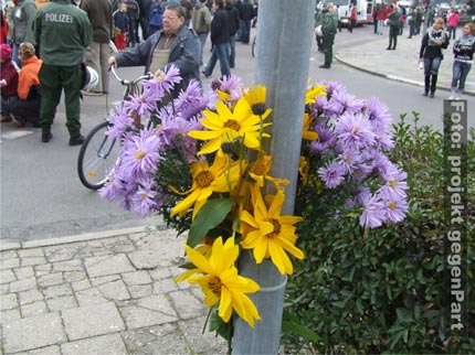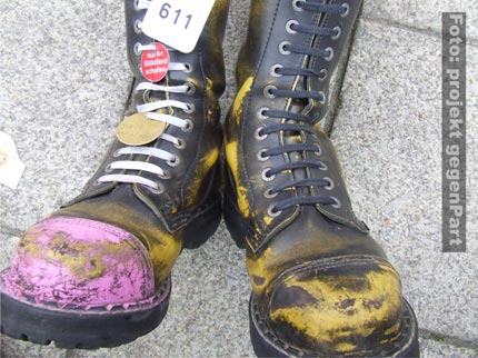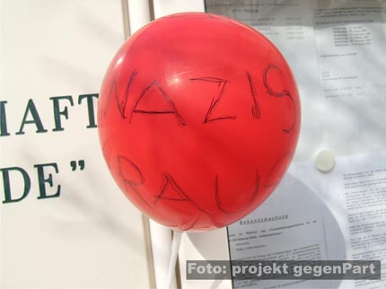 “Außer Hundehaufen heute nichts Braunes“, diese euphorische Aussage eines Polizeibeamten wurde wenig später leider ad absurdum geführt. Als der Demozug die Schlossstrasse erreichte, bewarfen sieben lokale Rechtsextremisten aus einem Privathaus heraus einige Demonstrationsteilnehmer mit Eiern und filmten diese unerlaubterweise mit einer Kamera. Die Polizei stürmte das Haus und stellte die Personalien der mutmaßlichen Neonazis fest. Außerdem wurde die Kamera beschlagnahmt. Die Polizei ermittelt nun wegen Beleidigung, Sachbeschädigung und dem Verstoß gegen das Kunsturheberrechtsgesetz. Darüber hinaus erstattete ein engagierter Bürger Anzeige wegen des Zeigens des verbotenen Hitlergrußes.