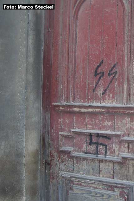 Ein Schlaglicht am Rande des Prozesses zeigte, wie selbstverständlich rechtsextreme Erscheinungen mittlerweile zur Alltagskultur Ostdeutschlands gehören. Nur wenige Meter vom Gerichtsgebäude stellten interessierte BeobachterInnen Hakenkreuzschmierereien und aufgesprühte SS-Runen fest. Eine Strafanzeige wegen der Verwendung von Symbolen verfassungswidriger Organisationen (§ 86a STGB) wurde erstattet.