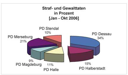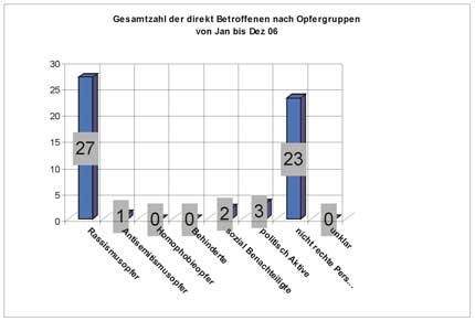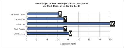 Von Januar bis Dezember 2006 sind der Dessauer Beratungsstelle für Opfer rechtsextremer Straf- und Gewalttaten 44 Angriffe mit einem rechten Hintergrund bekannt geworden.