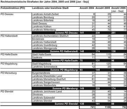 Die Entwicklungen in der Region Anhalt (Landkreise Köthen, Bitterfeld, Anhalt-Zerbst, Wittenberg, Bernburg und Stadt Dessau) sind nach wie vor dramatisch. So wurden insgesamt 44 rechtsextrem motivierten Gewalttaten bekannt. Das ist eine Steigerung um fast 30 % gegenüber dem Jahr 2005 (34 Gewalttaten).