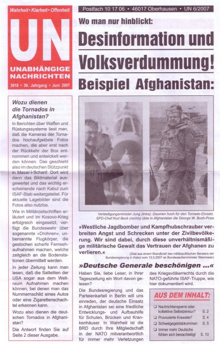 Weiterhin befand sich am 10. Juli 2007 eine Ausgabe der „Unabhängigen Nachrichten" im Briefkasten des Vereines. Diese Publikation ist eine bundesweit erscheinende Monatszeitschrift der rechtsextremistischen Gruppierung "Freundeskreis Unabhängiger Nachrichten e.V." Nach Einschätzung des Verfassungsschutzes Nordrhein-Westfalen "befassen sich die UN („Unabhängige Nachrichten“ Anm. d. Red.) schwerpunktmäßig mit Artikeln, welche die Kriegsschuld Deutschlands leugnen, die Verunglimpfung der freiheitlichen demokratischen Grundordnung beinhalten und die angeblich fortdauernde "Umerziehung" der Deutschen durch die alliierten Siegermächte anprangern."