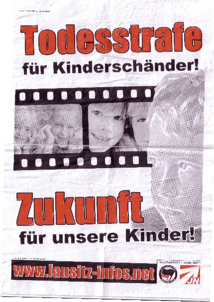 In der Nacht zum 09. Juli 2007 brachten Unbekannte ein Plakat der rechtsextremen Kampagne „Todesstrafe für Kinderschänder“ am Objekt des Vereins „Wir mit Euch“ an. Diese Kampagne wird laut dem Plakat von der JN („Junge Nationaldemokraten“ - Jugendorganisation der NPD) sowie den „Nationalen Sozialisten- Bundesweite Aktion“ unterstützt.