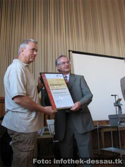 “Ich stehe hier als das älteste Mitglied unsere Gruppe vor Ihnen, die anderen sind alle arbeiten“, beschreibt Hans Hunger von der Forschungsgruppe Zyklon B prägnant das ehrenamtliche Engagement der 4 DessauerInnen. Das Bündnis für Demokratie und Toleranz zeichnet die Initiative mit einem Ehernpreis aus. Seit 1996 forscht und recherchiert die Gruppe zur Zyklon B-Produktion in der ehemaligen Dessauer Zuckerraffinerie, dem einstigen Hauptproduktionsstandort. Mit dem ursprünglich für die Schädlingsbekämpfung entwickelten Giftgas ermordeten die Nationalsozialisten in den deutschen Vernichtungslagern Millionen von Menschen, vor allem europäische Juden. Nach jahrelangem Kampf und gegen zum Teil erhebliche politische Widerstände war es der Forschungsgruppe schließlich gelungen, einen Informations- und Mahnpunkt Zyklon B durch zusetzten. Das Denkmal wurde am 27. Januar 2005, zum 60. Jahrestag der Befreiung des Konzentrations- und Vernichtungslagers Auschwitz, auf der Dessauer Brauereibrücke eingeweiht (mehr dazu hier...). und (hier...) „Wir wünschen uns dass der Mahnpunkt Bestandteil des Dessauer Kulturpfades wird und unsere Flyer in der Touristinformation ausgelegt werden“, skizziert Hans Hunger die nächsten Teilziele der Gruppe. Im nächsten Jahr soll zudem eine Broschüre erscheinen, die die Forschungsergebnisse der Gruppe zusammenfasst. www.zyklon-b.info