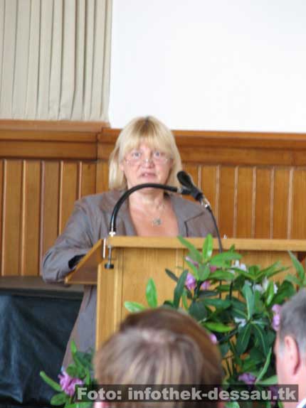 „Wir wollen durch solche dezentralen Veranstaltungen die Preisträger stärken“, so der Stellvertretende Geschäftsführer des Bündnisses, Dr. Reiner Schiller-Dickhut, zum politischen Lobby- und Verstärkerfunktion des Wettbewerbes. Seine Kollegin Uta Leichsenring nutzte dann die Gelegenheit, das Bündnis und deren Arbeitschwerpunkte und Intentionen kurz vorzustellen. So erwähnte sie den bundesweit beachteten „Victor-Klemperer-Wettbewerb“. Dem Bündnis gehe es vor allem darum „Regionen und Kommunen bei Aktionen und nachhaltigen Kampagnen gegen Rechtsextremismus“ zu unterstützen. In diesem Zusammenhang sei auch die Preisverleihung in Dessau zu sehen. „Ohne historisches Bewusstsein, ohne Kenntnis der Geschichte, ist keine Gegenwart zu gestalten“, brachte das Beiratsmitglied die wichtige Aufklärung über die Verbrechen des Nationalsozialismus auf eine griffige Formel. „Aus der Gruppe von Frauen und Männern ragen die hervor, die Probleme und Fakten benennen“, sagte sie anerkennend zu den Preisträgern. Das Totschlagsargument der vermeintlichen Nestbeschmutzer die am Image einer Stadt kratzten lässt sie dabei nicht gelten: „Das haben wir in den letzten 15 Jahren immer wieder gehört“. Uta Leichsenring kritisierte hinsichtlich des Wahlerfolges der NPD in Mecklenburg-Vorpommern den chronischen Geldmangel für Projekte gegen Rechts, der „ eine nachhaltige Entwicklung unmöglich mache“.